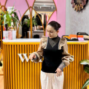 İthal Triko Bluz Kolları Saten İpek Boyun Kısmı Transparan Detaylı